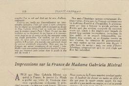 Impressions sur la France de madame Gabriela Mistral. [artículo] L'Amerique Latine (Revista : París, Francia)-- no. 750, (febrero 1946), p. 112. .