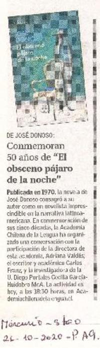 De José Donoso: Conmemoran 50 años de "El obsceno pájaro de la noche" [artículo] / El Mercurio (Diario : Santiago, Chile)-- oct. 26, 2020, p. A9. .