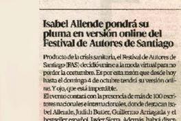 Isabel Allende pondrá su pluma en versión online de autores de Santiago. [artículo] La Cuarta (Diario : Santiago, Chile)-- oct. 1, 2020, P. 20. .