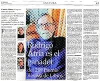 Rodrigo Atria es el ganador del 29° Premio Revista de Libros [artículo] María Teresa Cárdenas M.