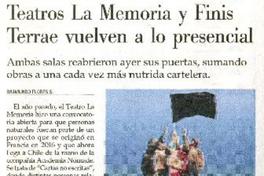 Teatros La Memoria y Finis Terrae vuelven a lo presencial [artículo] / Raimundo Flores. El Mercurio (Diario : Santiago, Chile)-- sep. 3, 2021, p. C10. .