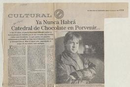 Ya nunca habrá catedral de chocolate en Porvenir [entrevista] / [artículo] : Philippe Dardel H. El Mercurio (Diario : Valparaíso, Chile)-- jul. 4, 1998, p. C13. .