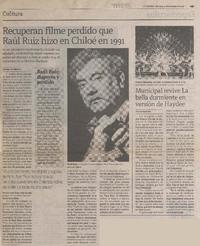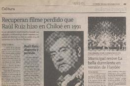 Recuperan filme perdido que Raúl Ruiz hizo en Chiloé en 1991 [artículo] / Rodrigo González M. La Tercera (Diario : Santiago, Chile)-- nov. 12, 2008, p. 49. .