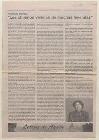 Fernando Villegas "Los chilenos vivimos de muchas leyendas". [entrevista] [artículo] : Aysén (Diario : Coyhaique, Chile)-- mayo 12, 2008, p. 2 (suplemento "Letras de Aysén"). .