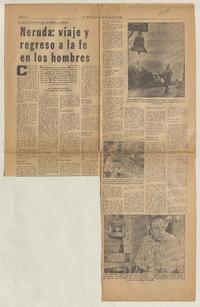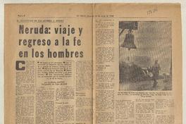 Neruda: viaje y regreso a la fe en los hombres. [artículo] El Siglo (Diario : Santiago, Chile)-- ene. 16, 1966, p. 8. .