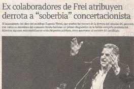 Ex colaboradores de Frei atribuyen derrota a "soberbia" concertacionista [artículo] / Paula García. La Tercera (Diario : Santiago, Chile)-- mayo 5, 2010, p. 10. .