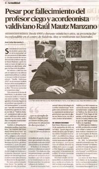 Pesar por fallecimiento del profesor ciego y acordeonista valdiviano Raúl Mautz Manzano [artículo] / Juan Carlos Hernández G. El Austral (Diario : Valdivia, Chile) octubre 30, 2022, página 6 1 página : ilustración en blanco y negro ; 30 cm. .