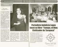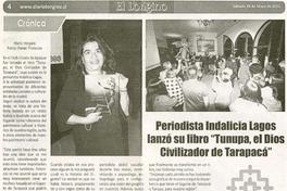 Periodista Indalicia Lagos lanzó su libro "Tunupa, el Dios Civilizador de Tarapacá [artículo] / Mario Vergara. El Longino (Diario : Iquique, Chile)-- Mayo 28, 2022, página 4. 1 página : ilustración en blanco y negro ; 21 cm. .