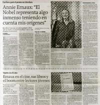 Annie Ernaux: "El Nobel representa algo inmenso teniendo en cuenta mis orígenes" [artículo]. El Sur (Diario : Concepción, Chile)-- Octubre 7, 2022, página 19 1 página : ilustraciones ; 36 cm. .