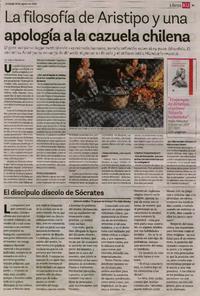La filosofía de Aristipo y una apología a la cazuela chilena [artículo] / Por Valeria Barahona. Diario Austral (Diario : Valdivia, Chile) Agosto 21, 2022, página 3 (suplemento "KU") El Austral (Diario : Osorno, Chile)-- Agosto 21, 2022, página 11 (suplemento "Domingo") El Mercurio de Valparaíso (Diario : Valparaíso, Chile) Agosto 21, 2022, página 3 (suplemento "KU") Diario El Sur (Concepción, Chile) Agosto 21, 2022, página 7 (suplemento "KU") 1 página : ilustración en color ; 38 cm. .