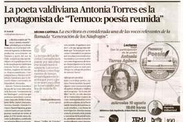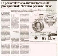 La poeta valdiviana Antonia Torres es la protagonista de "Temuco poesía reunida" [artículo] : El Austral (Diario : Valdivia, Chile) agosto 10, 2022, página 18 1 página : ilustración en blanco y negro ; 40 cm. .