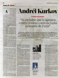 Andréi Kurkov escritor ucraniano "Es probable que la agresión contra Ucrania continúe hasta la muerte de Putin" [entrevista] / [artículo] : Por Alejandro Tapia. La Tercera (Diario : Santiago, Chile) octubre 1, 2022, página 20 2 página : ilustración a color ; 38 cm. .