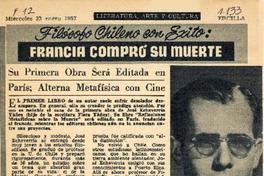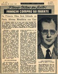 Su primera obra será editada en París; alterna metafísica con cine. [artículo] Ercilla (Revista : Santiago, Chile)-- no. 1133 (enero 1957), p. 12. .