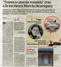 "Temuco : poesía reunida" trae a la escritora Marcia Henríquez [artículo]. El Austral (Diario : Temuco, Chile)-- jul. 5, 2022, p. 19. .