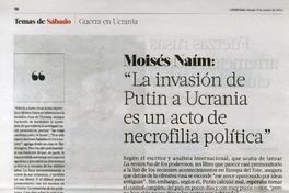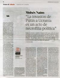 Moisés Naím : "La invasión de Putin a Ucrania es un acto de necrofilia política" [entrevista] / [artículo] : Por Juan Paulo Iglesias. La Tercera (Diario : Santiago, Chile)-- mar. 5, 2022, p. 16-17. .