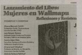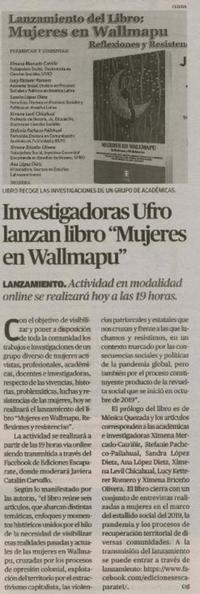Investigadoras Ufro lanzan libro "Mujeres en Wallmapu" [artículo]. El Austral (Diario : Temuco, Chile)-- abr. 21, 2022, p. 7. .