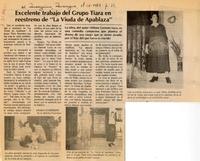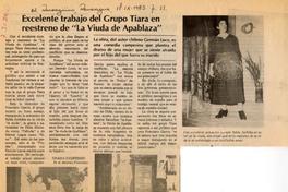 Excelente trabajo del grupo Tiara en reestreno de "La viuda de Apablaza" [artículo] El Rancagüino (Diario : Rancagua, Chile)-- sept. 17, 1985, p. 11. retr. .