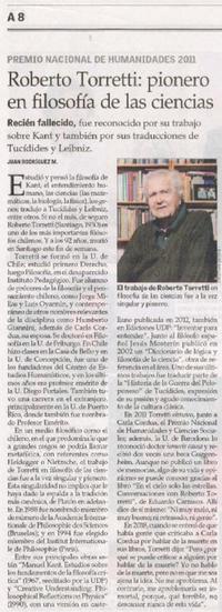 Roberto Torretti : pionero en filosofía de las ciencias [artículo] / Juan Rodríguez M. El Mercurio (Diario : Santiago, Chile) Noviembre 14, 2022, página A8 1 página : ilustraciones en color ; 27 cm. .