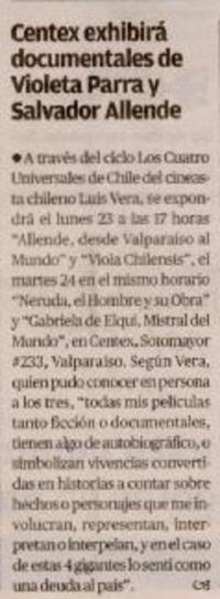 Centex exhibirá documentales de Violeta Parra y Salvador Allende [artículo]. El Mercurio de Valparaíso (Diario : Chile) Mayo 20, 2022, página 22 1 página : 13 cm. .