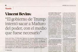 Vivent Bevins: "El gobierno de Trump intentó sacar a Maduro del poder, con el medio que fuese necesario" [entrevista] / [artículo] : Bastián Díaz. La Tercera (Diario : Santiago, Chile) julio 16, 2022, páginas 40-41 2 páginas : ilustración en color ; 37 cm. .