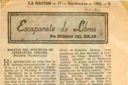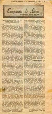 Boletín del Instituto de literatura chilena [artículo] / Hernán del Solar. La Nación (Diario : Santiago, Chile)-- sept. 1, 1963, p. 5. .
