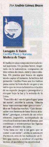 Lunagato y ratón [artículo] / Andrés Gómez Bravo. La Tercera (Diario : Santiago, Chile) Noviembre 5, 2022, página 63, (Reseña de libros) 1 página : ilustración en color ; 20 cm. .