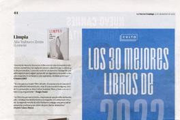 Los 30 mejores libros de 2022 [artículo] / Pablo Retamal Navarro. La Tercera (Diario : Santiago, Chile) Diciembre 11, 2022, página 44-46 1 página : ilustración en color ; 37,5 cm. .