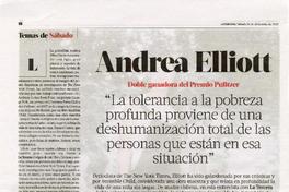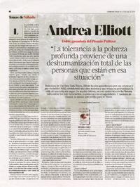 Andrea Elliott, "La tolerancia a la pobreza profunda, proviene de una deshumanización total de las personas que están en esa situación" [entrevista] / [artículo] : Paula Escobar Chavarria. La Tercera (Diario : Santiago, Chile) diciembre 24, 2022, página, 18-19 2 páginas : ilustración en color ; 33,3 cm. .