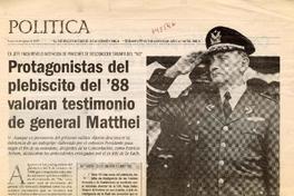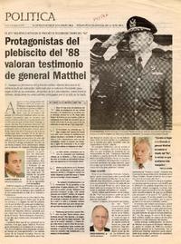 Protagonistas del plebiscito del '88 valoran testimonio de general Matthei. [artículo].