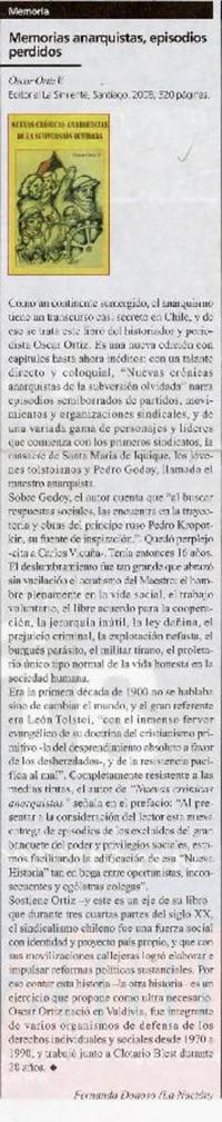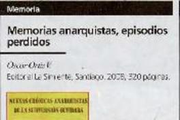 Memorias anarquistas, episodios perdidos [artículo] / Fernanda Donoso. Le Monde diplomatique (Diario : Santiago, Chile)-- no 91 (nov. 2008), p. 38. .