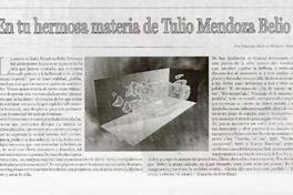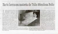 En tu hermosa materia de Tulio Mendoza Belio [artículo] / Edgardo Alarcón Romero. La Prensa (Curicó, Chile) sept. 28, 2008, p. 3 .