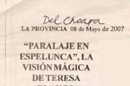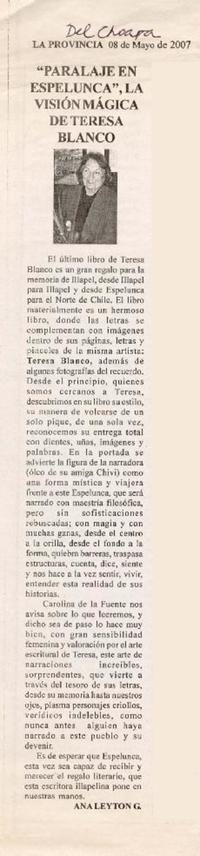 "Paralaje en Espelunca" la visión mágica de Teresa Blanco [artículo] / Ana Leyton G. La Provincia (Diario: Choapa, Chile)-- mayo 8, 2007 .