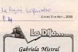 Gabriela Mistral [artículo] / Patricio Díaz Coudray. La Región (Coquimbo, Chile)-- abr. 3, 2008, p. 4. .
