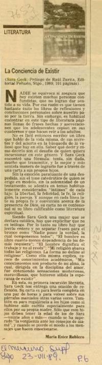 La conciencia de existir [artículo] / María Ester Roblero. El Mercurio (Diario : Santiago, Chile)-- jul. 23, 1989, p. 6 (suplemento) ret. .