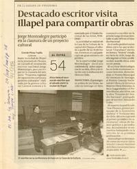 Destacado escritor visita Illapel para compartir obras [artículo]/ Cristián Pérez Trujillo. El Día (Diario : La Serena, Chile)-- sept. 29, 2008, p. 28 (suplemento "Tiempo Libre") .