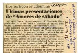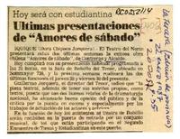 Ultimas presentaciones de "Amores de sábado" [artículo] / Dora Chipoco Jorquera. La Tercera (Diario : Santiago, Chile)-- ene. 22, 1987, p. 35 (edición provincia) .