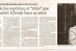 La casa de los espíritus, el "tifón" que elevó a Isabel Allende hace 40 años [artículo]. El Sur (Diario : Concepción, Chile)-- Octubre 9, 2022, página 19 El Mercurio de Valparaíso (Diario : Chile) Octubre 9, 2022, página 22 1 página : ilustraciones en blanco y negro; 23 cm. .
