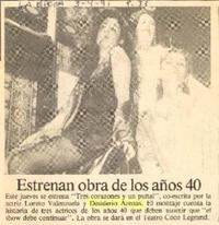 Estrenan obra de los años 40. [artículo] La Época (Diario : Santiago, Chile)-- Septiembre 3, 1991, página 33. 1 página : ilustración en blanco y negro ; 11 cm. .