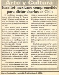 Escritor mexicano comprometido para dictar charlas en Chile [artículo] Chañarcillo -- dic. 26, 1994, p. 1. .