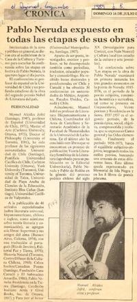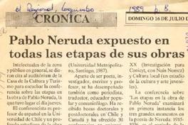 Pablo Neruda expuesto en todas las etapas de sus obras [artículo] El Regional (Diario : Coquimbo, Chile)-- jul. 16, 1989, p. 8. 1 página : ilustraciones en blanco y negro; 30 cm. .