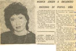Mónica Jensen a encuentro nacional de poetas, Viña [artículo] El Llanquihue (Diario : Puerto Montt, Chile)-- nov. 13, 1987, p. 8. 1 página : ilustraciones en blanco y negro; 15,5 cm. .