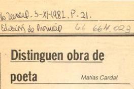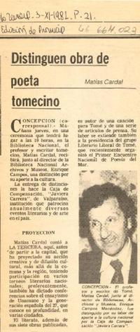 Distinguen obra de poeta tomecino. [artículo] La Tercera (Diario : Santiago, Chile)-- nov. 3, 1982, p. 21. 1 página : ilustraciones en blanco y negro ; 22 cm. .