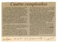 Cuatro cumpleaños. [artículo] La Época (Diario : Santiago, Chile)-- jun. 26, 1994, p. 7, (suplemento). .