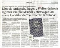 Una nueva Constitución será lanzado el próximo jueves: Libro de Arriagada, Bustos y Walker defiende régimen semipresidencial y afirma que una nueva Constitución "no reescribe la historia" Guillermo Muñoz. El Mercurio, (Diario: Santiago, Chile)-- mar. 26, 2017, p.C4. .