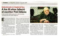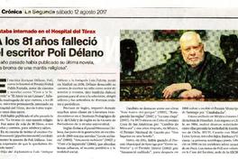 Estaba internado en el hospital del Tórax A los 81 años falleció el escritor Poli Délano / [artículo] : La Segunda (Diario : Santiago, Chile)-- agost. 12, 2017 p. 6. .