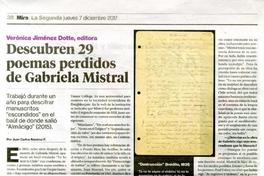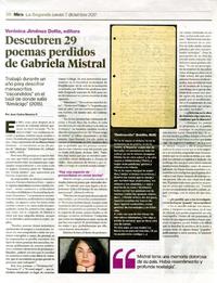 Descubren 29 poemas perdidos de Gabriela Mistral [artículo] / Juan Carlos Ramírez. La Segunda (Diario : Santiago, Chile)-- dic. 7, 2017, p. 38. .