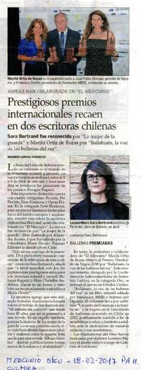 Prestigiosos premios internacionales recaen en dos chilenas [artículo] / Maureen Lennon. El Mercurio (Diario : Santiago, Chile)-- feb. 18, 2017, p. A11. .