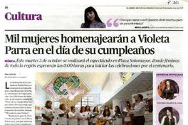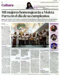 Mil mujeres homenajearán a Violeta Parra en el día de su cumpleaños / [artículo] : Flor Arbulú. El Mercurio de Valparaíso (Diario : Chile)-- sep. 29, 2017, p. 30. .
