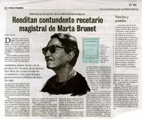 Reeditan contundente recetario magistral de Marta Brunet [artículo] / Fabían Llanca. Las Últimas Noticias (Diario : Santiago, Chile) dic. 18, 2018, p. 46. .