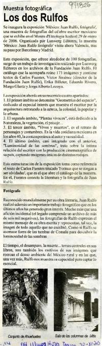 Los dos Rulfos [artículo] Ultima Hora (Diario : Temuco, Chile)-- nov. 30, 2005, p. 14 1 página : ilustraciones en blanco ynegro ; 30 cm. .